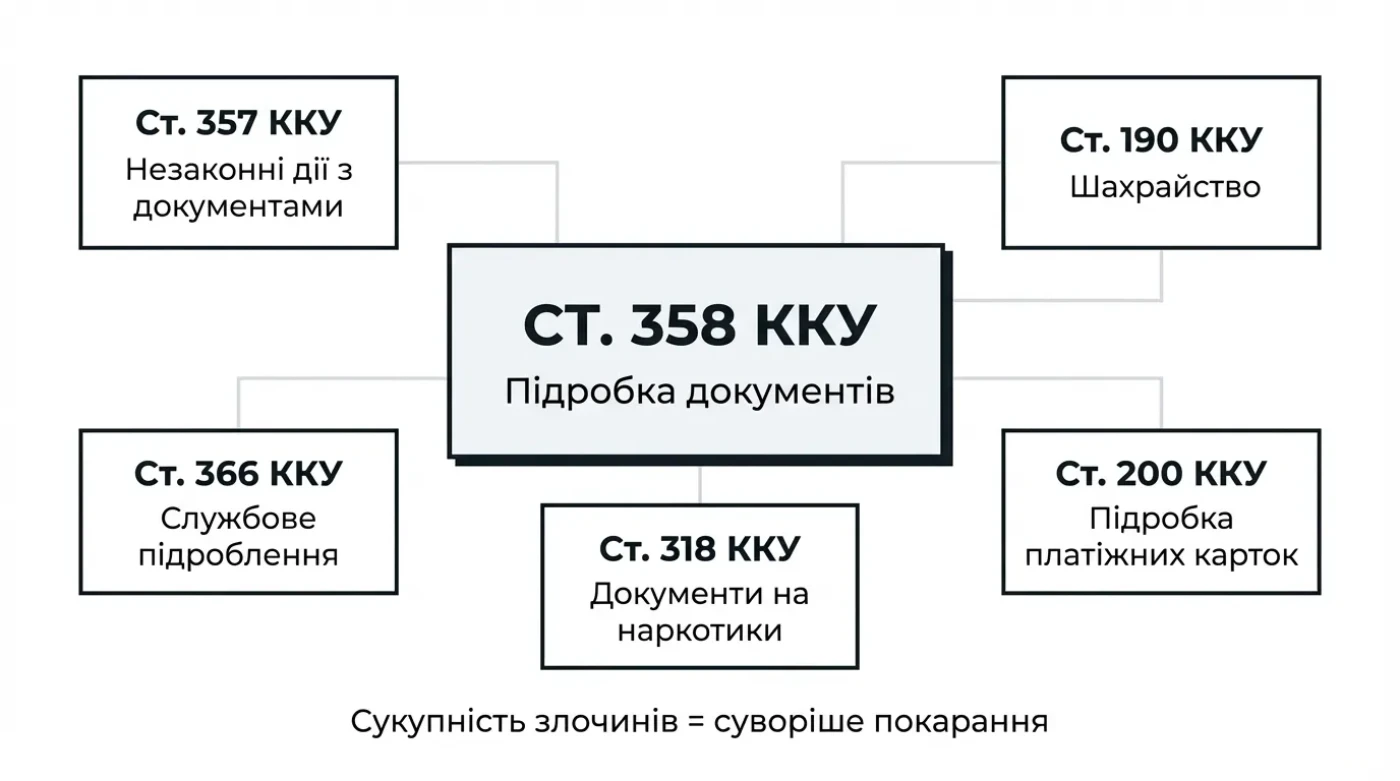 Підробка документів часто кваліфікується «в пакеті» з іншими діями, якщо документ був лише інструментом. Це впливає і на ризики, і на стратегію захисту. Розуміння зв'язків між статтями допомагає передбачити можливу кваліфікацію та підготувати ефективний захист.